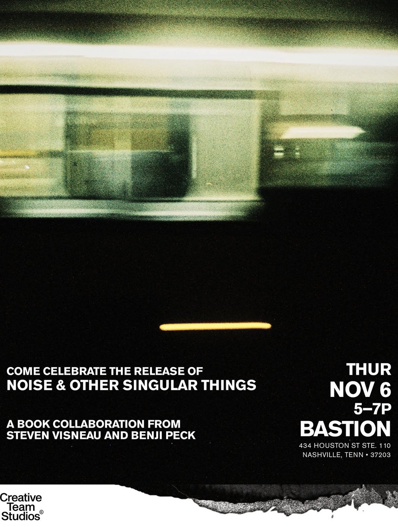 Bastion Welcomes “Noise and Other Singular Things” Oct 16 Written By Jordan Farrell Thursday, November 6COME CELEBRATETHE RELEASE OFNOISE & OTHER SINGULAR THINGSA BOOK COLLABORATION FROM STEVEN VISNEAU AND BENJI PECKTHUR • NOV 6 • 5-7P BASTION434 HOUSTON ST STE 110NASHVILLE, TENN 37203 Learn More! BASTION Jordan Farrell