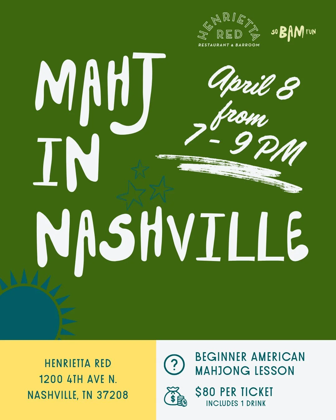 Join us at Henrietta Red for a beginner-friendly American Mahjong class in partnership with SoBamFun. Perfect for a midweek night out, date night, or something new with friends.